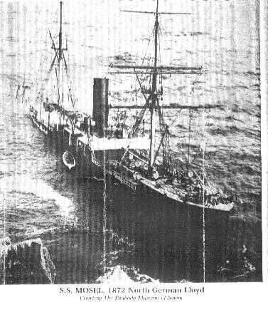 THIS IS THE SHIP THE SS MOSEL WE BELIEVE IN WHICH HE CAME HERE AND LANDED AT CASTLE GARDEN